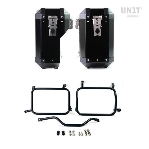 Portabolsas de aluminio con frontal hypalon regulable y enganche rápido + chasis thriumph scrambler 400 x dx (sólo compatible con nuestro escape bajo código: 4206low)