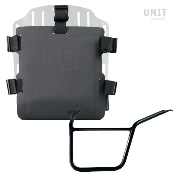 placa, que está provista de un bloqueo para bloquear en el propio marco. La placa crea una superficie de montaje plana en el costado de la bicicleta, esto permitirá el transporte de bolsas sueltas u otros objetos, como sacos de dormir, chaquetas, etc. La solapa frontal, con atención a los detalles más pequeños, con acabados de Hypalon, se puede ajustar mediante los deslizadores suministrados y se puede quitar muy rápidamente de la placa.