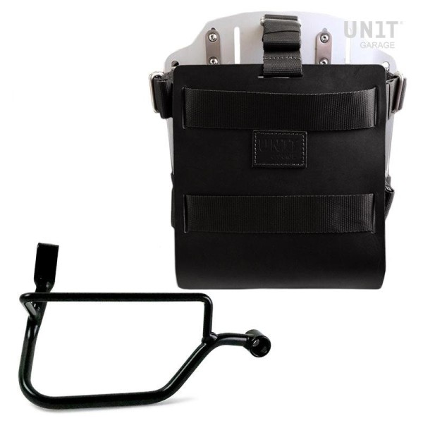 Placa portabolsas de aluminio anodizado con frontal de cuero ajustable. Se fija rápidamente a nuestros marcos portabolsas con el sistema de liberación rápida código U000 ya incluido y montado en la parte posterior de la placa , que está equipada con un bloqueo para bloquear en el propio marco. La placa crea una superficie de montaje plana en el lateral de la motocicleta, esto permitirá el transporte de bolsas sin accesorios u otros objetos, como sacos de dormir, chaquetas, etc. La solapa frontal, cuidada hasta el más mínimo detalle con acabados en piel de 3 mm, se puede ajustar mediante los cursores suministrados y se puede retirar muy rápidamente de la placa.