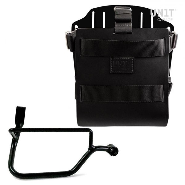 Placa portabolsas de aluminio anodizado con frontal de cuero ajustable. Se fija rápidamente a nuestros marcos portabolsas con el sistema de liberación rápida código U000 ya incluido y montado en la parte posterior de la placa , que está equipada con un bloqueo para bloquear en el propio marco. La placa crea una superficie de montaje plana en el lateral de la motocicleta, esto permitirá el transporte de bolsas sin accesorios u otros objetos, como sacos de dormir, chaquetas, etc. La solapa frontal, cuidada hasta el más mínimo detalle con acabados en piel de 3 mm, se puede ajustar mediante los cursores suministrados y se puede retirar muy rápidamente de la placa.