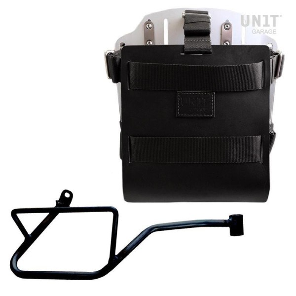 Placa portabolsas de aluminio anodizado con frontal de cuero ajustable. Se fija rápidamente a nuestros marcos portabolsas con el sistema de liberación rápida código U000 ya incluido y montado en la parte posterior de la placa , que está equipada con un bloqueo para bloquear en el propio marco. La placa crea una superficie de montaje plana en el lateral de la motocicleta, esto permitirá el transporte de bolsas sin accesorios u otros objetos, como sacos de dormir, chaquetas, etc. La solapa frontal, cuidada hasta el más mínimo detalle con acabados en piel de 3 mm, se puede ajustar mediante los cursores suministrados y se puede retirar muy rápidamente de la placa.