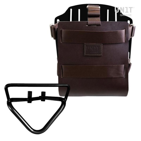 Placa portabolsas de aluminio anodizado con frontal de piel regulable. Se adhiere rápidamente a nuestros marcos portabolsas con el sistema de liberación rápida código U000 ya incluido y montado en la parte posterior de la placa , que está equipada con un candado para bloquear en el marco mismo. La placa crea una superficie de montaje plana en el costado de la bicicleta, esto permitirá el transporte de bolsas sueltas u otros objetos, como sacos de dormir, chaquetas, etc. La solapa frontal, con atención a los detalles más pequeños con acabados de cuero de 3 mm, se puede ajustar con los deslizadores suministrados y se puede quitar muy rápidamente de la placa.