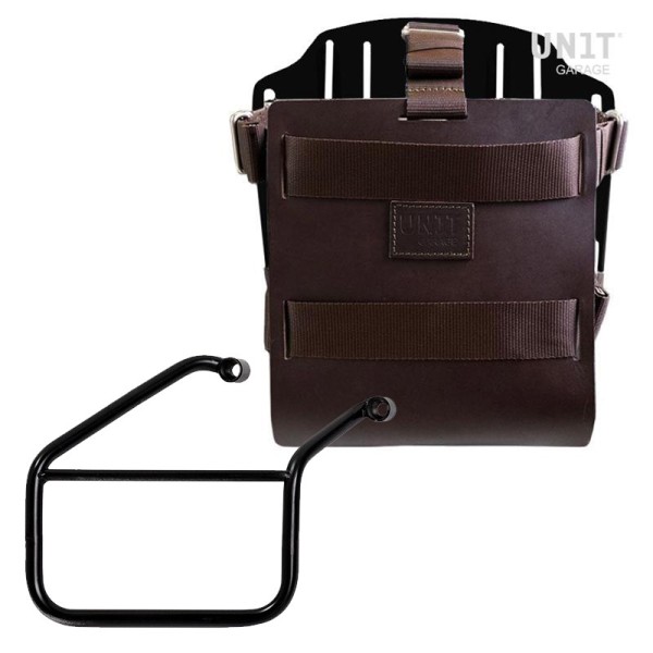 Placa portabolsas de aluminio anodizado con frontal de cuero regulable. Se fija rápidamente a nuestros marcos portabolsas con el sistema de liberación rápida código U000 ya incluido y montado en la parte posterior de la placa , que está equipada con una cerradura para bloquear en el propio marco. La placa crea una superficie de montaje plana en el costado de la bicicleta, esto permitirá el transporte de bolsas sueltas u otros objetos, como sacos de dormir, chaquetas, etc. La solapa frontal, con atención a los detalles más pequeños con acabados de cuero de 3 mm, se puede ajustar con los cursores suministrados y se puede quitar muy rápidamente de la placa.