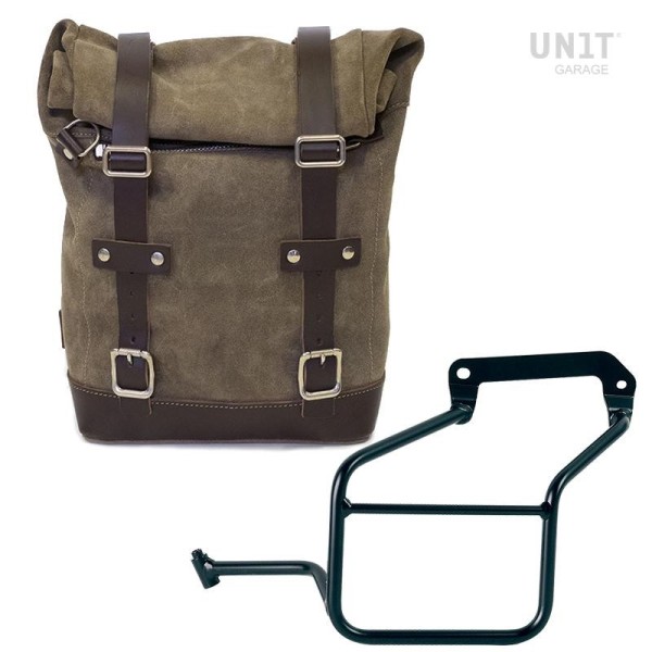 tratado con cera que lo hace resistente al agua. Con atención a los detalles más pequeños con acabados en cuero de 3 mm, simple y puro como los materiales con los que fue construido. Se conecta rápidamente a nuestro marco portabolsas con el sistema de liberación rápida aplicado a la parte posterior de la bolsa que está equipada con un candado para bloquear. Puede contener un portátil de 15" en su interior, está equipado con un gran bolsillo con cremallera para teléfono y documentos.