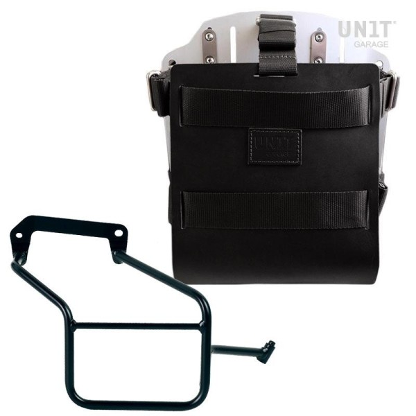 Placa portabolsas de aluminio anodizado con frontal de cuero regulable. Se fija rápidamente a nuestros marcos portabolsas con el sistema de liberación rápida código U000 ya incluido y montado en la parte posterior de la placa , que está equipada con una cerradura para bloquear en el propio marco. La placa crea una superficie de montaje plana en el costado de la bicicleta, esto permitirá el transporte de bolsas sueltas u otros objetos, como sacos de dormir, chaquetas, etc. La solapa frontal, con atención a los detalles más pequeños con acabados de cuero de 3 mm, se puede ajustar con los cursores suministrados y se puede quitar muy rápidamente de la placa.