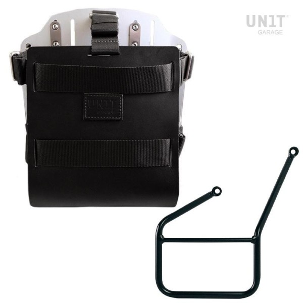 Placa portabolsas de aluminio anodizado con frontal de cuero ajustable. Se fija rápidamente a nuestros marcos portabolsas con el sistema de liberación rápida código U000 ya incluido y montado en la parte posterior de la placa , que está equipada con una cerradura para bloquear en el propio marco. La placa crea una superficie de montaje plana en el costado de la bicicleta, esto permitirá el transporte de bolsas sueltas u otros objetos, como sacos de dormir, chaquetas, etc. La solapa frontal, con atención a los detalles más pequeños con acabados de cuero de 3 mm, se puede ajustar con los cursores suministrados y se puede quitar muy rápidamente de la placa.