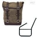 tratado con cera que lo hace resistente al agua. Con atención a los detalles más pequeños con acabados en cuero de 3 mm, simple y puro como los materiales con los que fue construido. Se conecta rápidamente a nuestro marco portabolsas con el sistema de liberación rápida aplicado a la parte posterior de la bolsa que está equipada con un candado para bloquear. Puede contener un portátil de 15" en su interior, está equipado con un gran bolsillo con cremallera para teléfono y documentos.