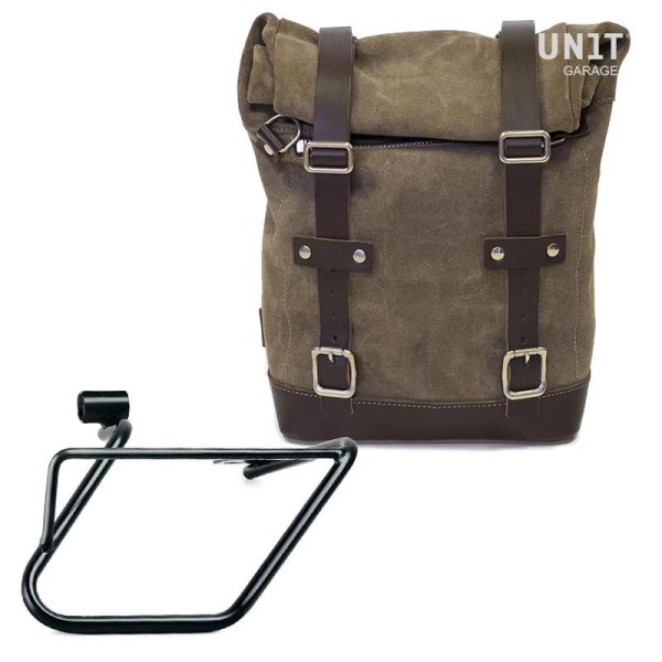 tratado con cera que lo hace resistente al agua. Con atención a los detalles más pequeños con acabados en cuero de 3 mm, simple y puro como los materiales con los que fue construido. Se conecta rápidamente a nuestro marco portabolsas con el sistema de liberación rápida aplicado a la parte posterior de la bolsa que está equipada con un candado para bloquear. Puede contener un portátil de 15" en su interior, está equipado con un gran bolsillo con cremallera para teléfono y documentos.