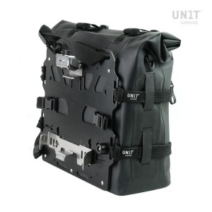 - Placa trasera en aleación de aluminio con recubrimiento de polvo integrada en la bolsa con sistema de enganche rápido en acero inoxidable y cerradura (2 llaves incluidas para cada bolsa)