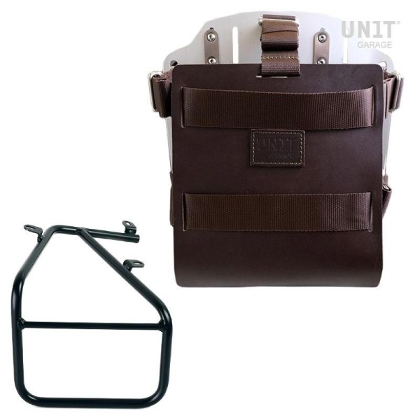 Placa portabolsas de aluminio anodizado con frontal de cuero regulable. Se fija rápidamente a nuestros marcos portabolsas con el sistema de liberación rápida código U000 ya incluido y montado en la parte posterior de la placa , que está equipada con una cerradura para bloquear en el propio marco. La placa crea una superficie de montaje plana en el costado de la bicicleta, esto permitirá el transporte de bolsas sueltas u otros objetos, como sacos de dormir, chaquetas, etc. La solapa frontal, con atención a los detalles más pequeños con acabados de cuero de 3 mm, se puede ajustar con los controles deslizantes suministrados y se puede quitar muy rápidamente de la placa.