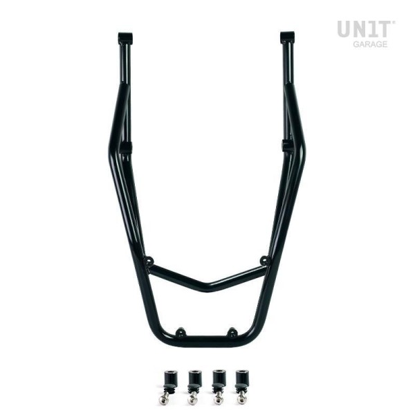 Portaequipajes fabricado en tubo de acero inoxidable con acabado en polvo epoxi negro. Completa la parte trasera y está equipado con asideros para el pasajero. Se fija de forma muy sencilla al cuadro de la moto en los 4 puntos de fijación proporcionados por Ducati. Es compatible con todos nuestros soportes para alforjas. Por lo tanto, puede montar tanto el portaequipajes como los soportes de las bolsas al mismo tiempo utilizando las fijaciones originales sin realizar ningún cambio en la bicicleta. Robusto y práctico, completa la estética de la moto.
