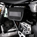 Este soporte de acero con recubrimiento de polvo epoxi le permite montar nuestras bolsas y rematar perfectamente el área del paso de escape alto en el panel lateral.