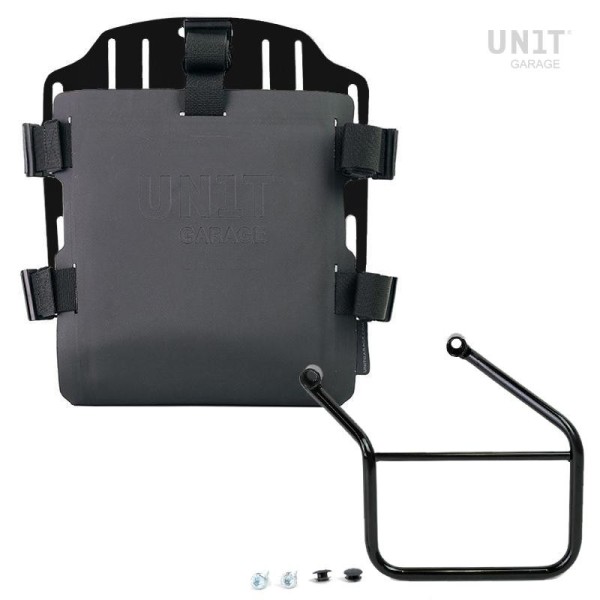 Placa portabolsas de aluminio anodizado completa con frontal Hypalon ajustable. Se fija rápidamente a nuestros marcos portabolsas con el sistema de liberación rápida código U000 ya incluido y montado en la parte posterior del   placa, que está equipada con un bloqueo para bloquear el propio marco. La placa crea una superficie de montaje plana en el lateral de la motocicleta, esto permitirá el transporte de bolsas sin accesorios u otros objetos, como sacos de dormir, chaquetas, etc. La solapa frontal, cuidada hasta el más mínimo detalle, con acabados Hypalon, se puede ajustar mediante los cursores suministrados y se puede retirar muy rápidamente de la placa.