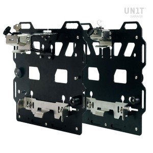 Placa portabolsas de aluminio anodizado con frontal de cuero ajustable. Se fija rápidamente a nuestros marcos portabolsas con el sistema de liberación rápida código U000 ya incluido y montado en la parte posterior de la placa , que está equipada con un bloqueo para bloquear en el propio marco. La placa crea una superficie de montaje plana en el lateral de la motocicleta, esto permitirá el transporte de bolsas sin accesorios u otros objetos, como sacos de dormir, chaquetas, etc. La solapa frontal, cuidada hasta el más mínimo detalle con acabados en piel de 3 mm, se puede ajustar mediante los cursores suministrados y se puede retirar muy rápidamente de la placa.