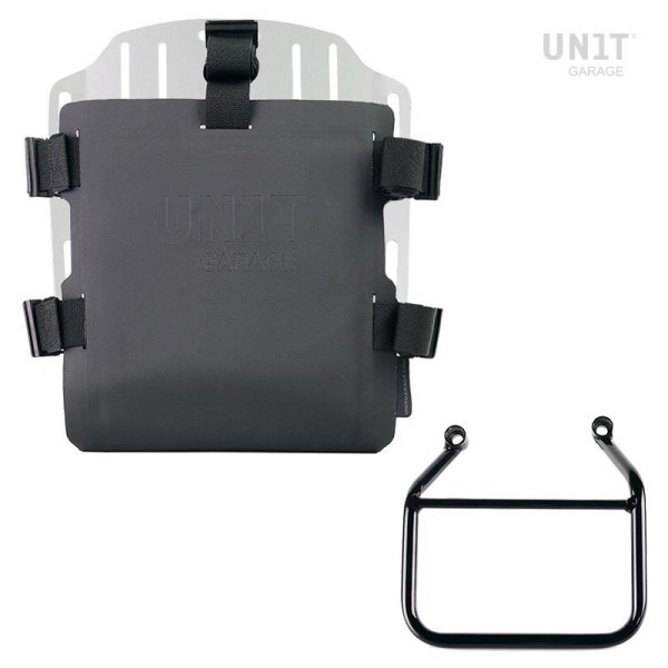 Placa portabolsas de aluminio anodizado completa con frontal Hypalon ajustable. Se fija rápidamente a nuestros marcos portabolsas con el sistema de liberación rápida código U000 ya incluido y montado en la parte posterior del   placa, que está equipada con un bloqueo para bloquear el propio marco. La placa crea una superficie de montaje plana en el lateral de la motocicleta, esto permitirá el transporte de bolsas sin accesorios u otros objetos, como sacos de dormir, chaquetas, etc. La solapa frontal, cuidada hasta el más mínimo detalle, con acabados Hypalon, se regula mediante los cursores suministrados y se retira muy rápidamente de la placa.