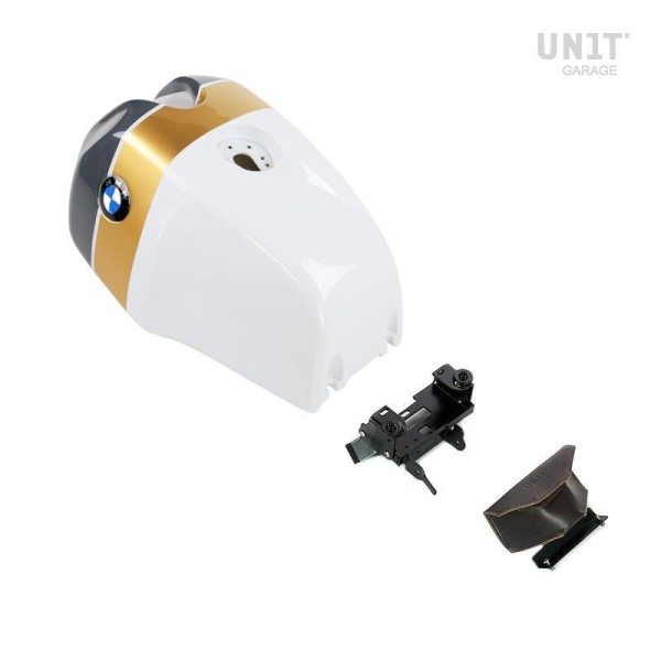 Depósito nineT/7 : El tapón del depósito y la bomba de gasolina siguen siendo los originales de tu moto, la luz de reserva seguirá funcionando, no tendrás que manipular nada, el kit es completamente reversible. El depósito de nailon se suministra pintado y completo con adhesivos transparentes. (en la versión blanca deben adquirirse por separado) El filtro de carbón activado (bote) original sigue siendo el original. Todos los soportes para la fijación del depósito se suministran en el kit. La capacidad es de 18,5 litros, el depósito de garaje nineT/7 Unit pesa 2 kg menos que el original. Nota: aprobado por TÜV