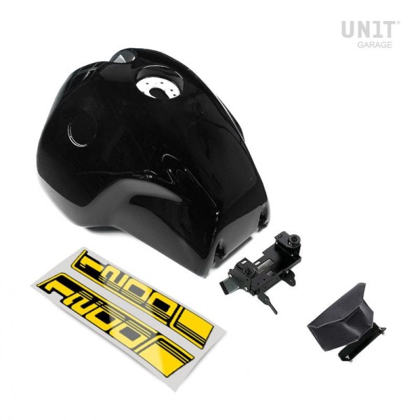 El depósito de nailon se suministra pintado en negro brillante completo con adhesivos. El depósito es más corto para poder avanzar y cargar mejor el tren delantero. Ya no tendrás la extraña sensación de distanciamiento del manillar, la sensación de conducción cambia a mejor. El tapón del depósito, la bomba de gasolina y el filtro de carbón activado (canester) siguen siendo los originales de tu moto. El indicador de reserva seguirá funcionando, no tendrás que manipular nada, el kit es completamente reversible. Todos los soportes para la fijación del depósito se suministran en el kit.
