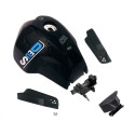 El depósito de nailon se suministra pintado en negro brillante. Las pegatinas se incluyen debajo de transparente. El depósito es más corto para poder avanzar y cargar mejor la parte delantera. Ya no tendrás la extraña sensación de distancia del manillar, la sensación de conducción cambia para mejor. El tapón del depósito, la bomba de gasolina y el filtro de carbón activado (bote) siguen siendo los originales de tu moto. La luz de reserva seguirá funcionando, no tendrás que manipular nada, el kit es completamente reversible. Todos los soportes para la fijación del depósito se suministran en el kit.