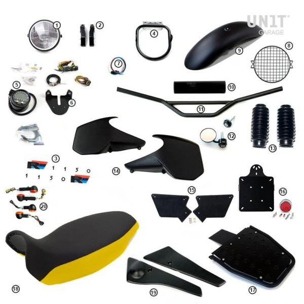El Kit R1150R ahora también está disponible en la versión BÁSICA. El frente es mucho más minimalista y el radiador está ubicado frente al motor. La bicicleta se vuelve muy básica y liviana, hermosa sin parabrisas o alternativamente con parabrisas código: 1236 o código: 1575.
