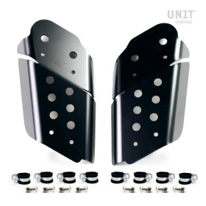 Queríamos paneles laterales que completaran el depósito de forma mínima y que permitieran dejar los radiadores a la vista. Fabricados en tubo con acabado negro mate con polvos epoxi, están preparados para alojar las gomas antivibración originales y los radiadores. Fácil de montar (los conductos de aceite NO deben desmontarse). Perfectas para hacer tu especial, albergan los logos de los transportadores originales que debes quitar de tu moto.