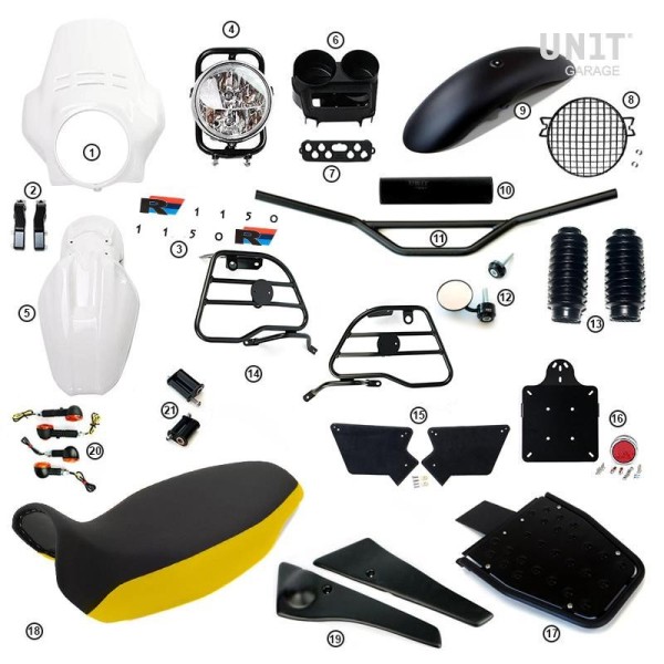 Retoma el aspecto de la legendaria R80 GS PD adaptada y revisada para nuestros KIT. Muy ligero, con acabado Alpinewhite o Matt Black o Red. Tiene una buena protección aerodinámica y viene completo con soportes de fijación.