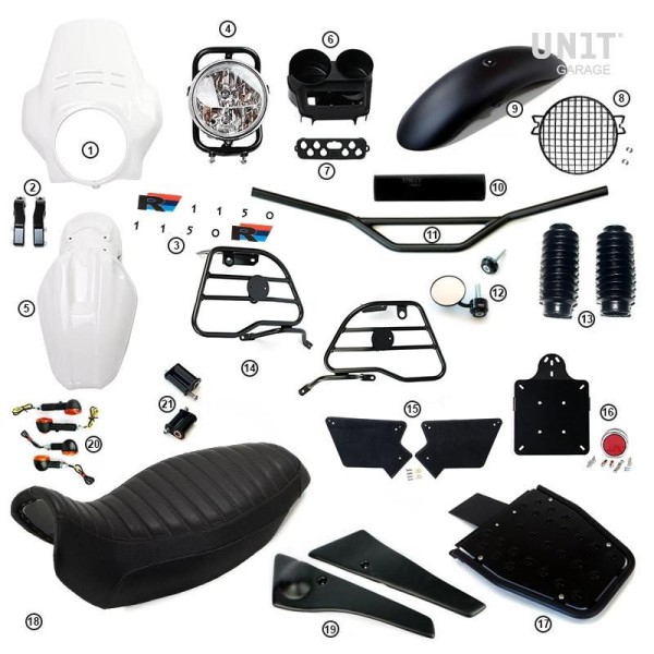 Retoma el aspecto de la legendaria R80 GS PD adaptada y revisada para nuestros KIT. Muy ligero, con acabado Alpinewhite o Matt Black o Red. Tiene una buena protección aerodinámica y viene completo con soportes de fijación.