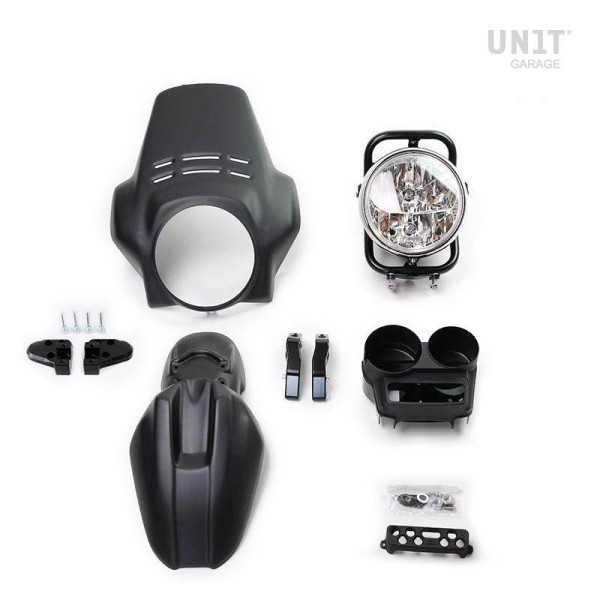 Se monta fácilmente sobre Riser Cod. 1555 y permite el alojamiento del faro, el guardabarros alto, los intermitentes originales y las pantallas opcionales.