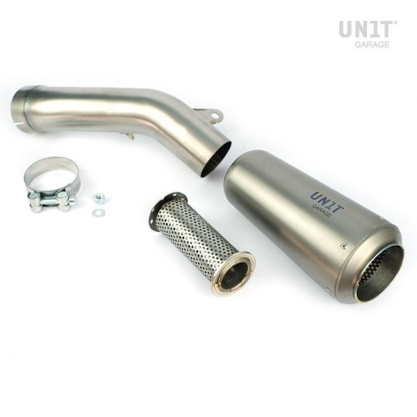 Silenciador de titanio y racores de acero inoxidable trabajados totalmente a mano, en perfecto estilo moto gp.