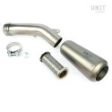 Silenciador de titanio y racores de acero inoxidable trabajados totalmente a mano, en perfecto estilo moto gp.