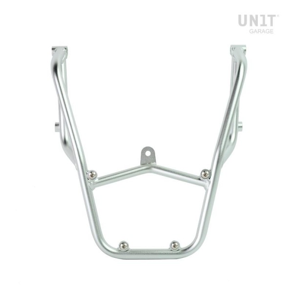 Portaequipajes fabricado en tubo de acero con acabado en polvo epoxi negro mate. Completa la parte trasera y está equipada con asas para el pasajero, se fija de forma muy sencilla a la moto original con los tornillos suministrados. Robusto y práctico, está equipado con 4 casquillos en la superficie de apoyo para la fijación de la placa código: AL5 (se pueden adquirir por separado o ya incluidos en el top case Atlas código: AL3).