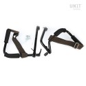 Está equipado con grapas elásticas y ganchos con adornos de cuero.